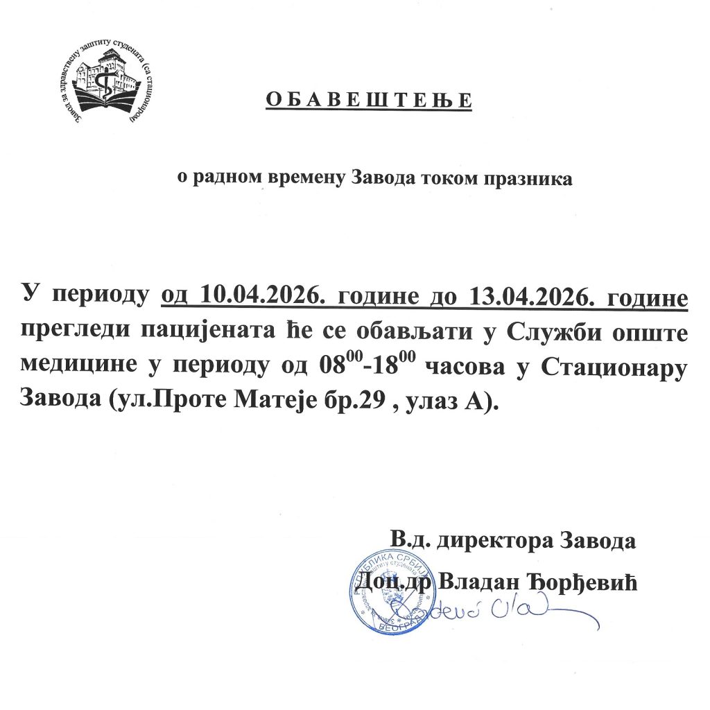 НЕДЕЉНИ РАСПОРЕД РАДА ЛЕКАРА СЕ ОБЈАВЉУЈЕ НА ИНТЕРНЕТ СТРАНИЦИ ЗАВОДА