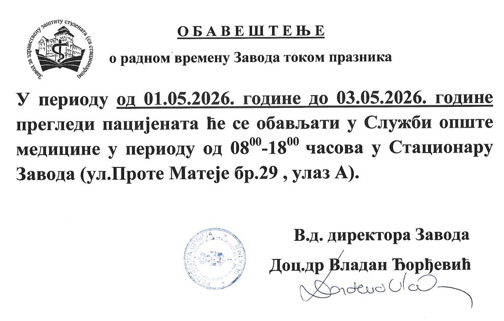 ПОШТОВАНИ СТУДЕНТИ, ОБАВЕШТАВАМО ВАС ДА СЕ ЛЕКАРСКИ ПРЕГЛЕДИ ЗА УСЕЉЕЊЕ У СТУДЕНТСКЕ ДОМОВЕ МОГУ ОБАВИТИ ОД 23.09.2024.ГОДИНЕ!